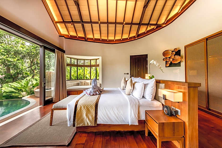 Two pools set the tone for days in Ubud: a private pool for quiet dips and a free outdoor pool with a scenic view, open year-round. On-site dining comes via Tanarasa, a restaurant that blends Traditional and Modern ambiances and serves American and Asian cuisines.